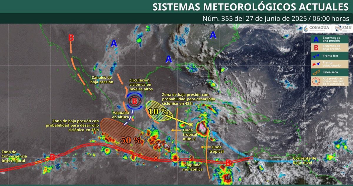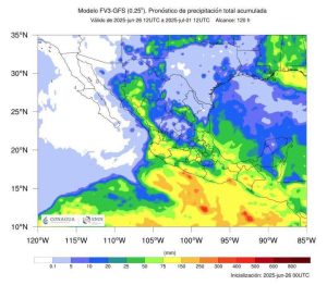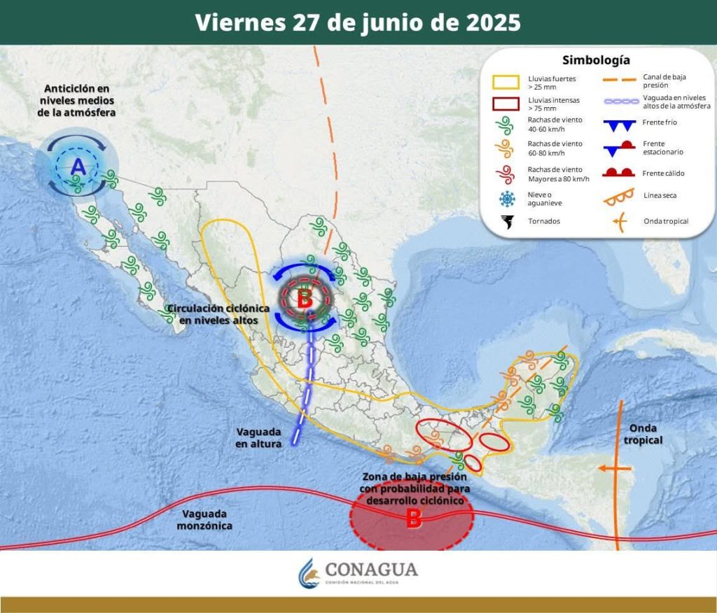 Nubosidad ocasional en gran parte del estado con bancos de niebla dispersos y posibilidad de lluvias con intervalos de chubascos de 5 a 25 mm para los municipios del norte, centro-sur, suroeste, sureste y sur del estado, durante la tarde y noche.