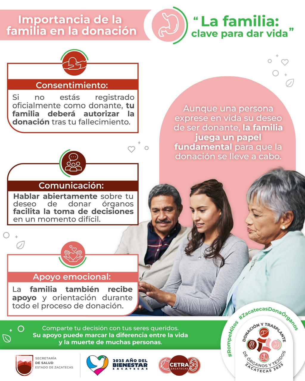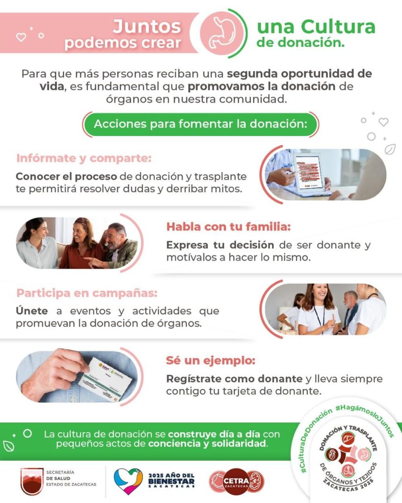 Zacatecas, Zac., 9 de julio de 2025.- Fomentar valores relacionados con el altruismo y la generosidad es una acción emprendida por el Gobierno de Zacatecas, encabezado por el mandatario estatal David Monreal Ávila; a través de la Secretaría de Salud (SSZ), hace un llamado a la sociedad para hablar en familia sobre el tema de donación de órganos y tejidos.