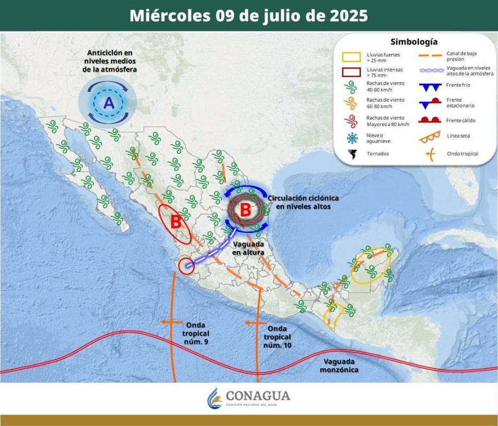 Nubosidad ocasional en gran parte del estado con bancos de niebla dispersa en las regiones del noroeste y suroeste, con posibilidad de lluvias fuertes con puntuales fuertes de 50 a 75 mm para los municipios del noroeste, oeste y sur del estado, durante la tarde y noche.