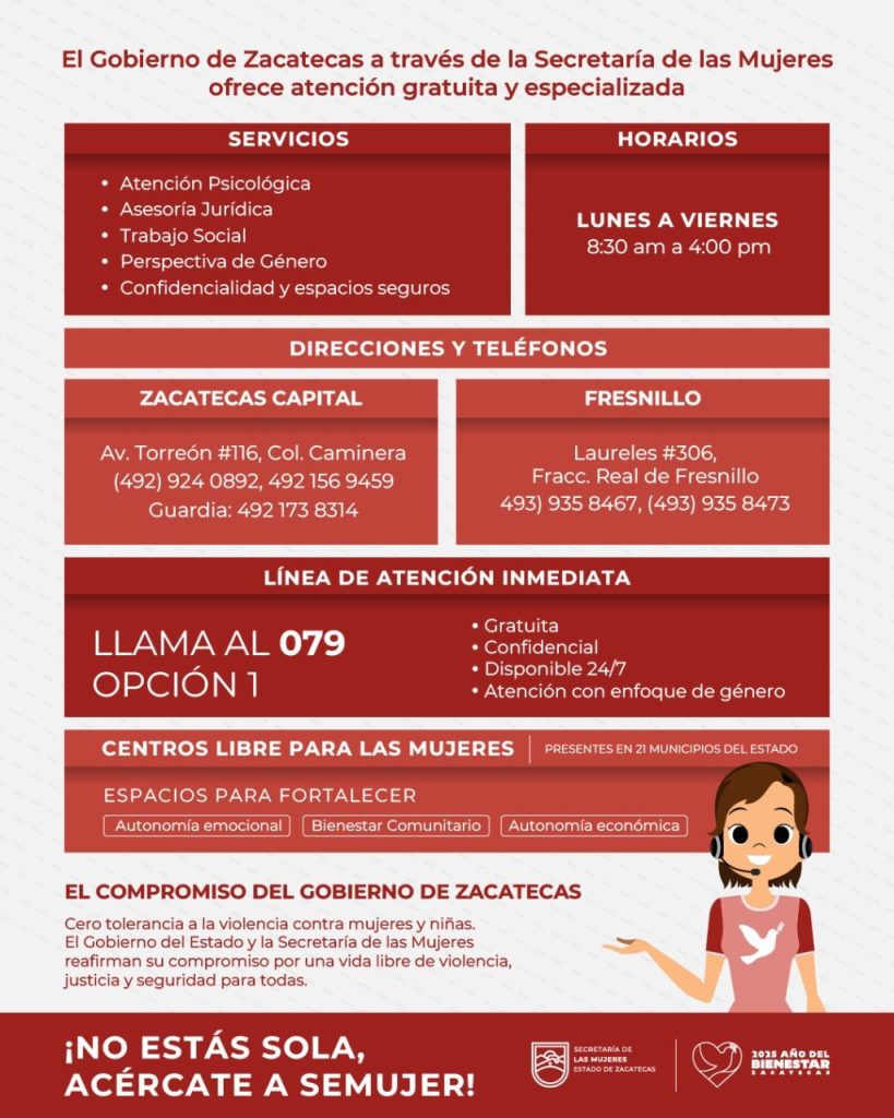 El Gobierno de Zacatecas, a través de la Secretaría de las Mujeres (Semujer), garantiza la operación de servicios de atención psicológica, jurídica y de trabajo social, dirigidos a mujeres en situación de violencia. Estos servicios son gratuitos, confidenciales y con perspectiva de género.