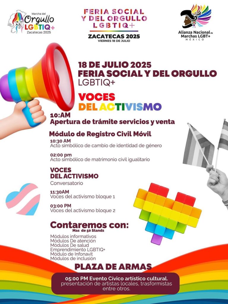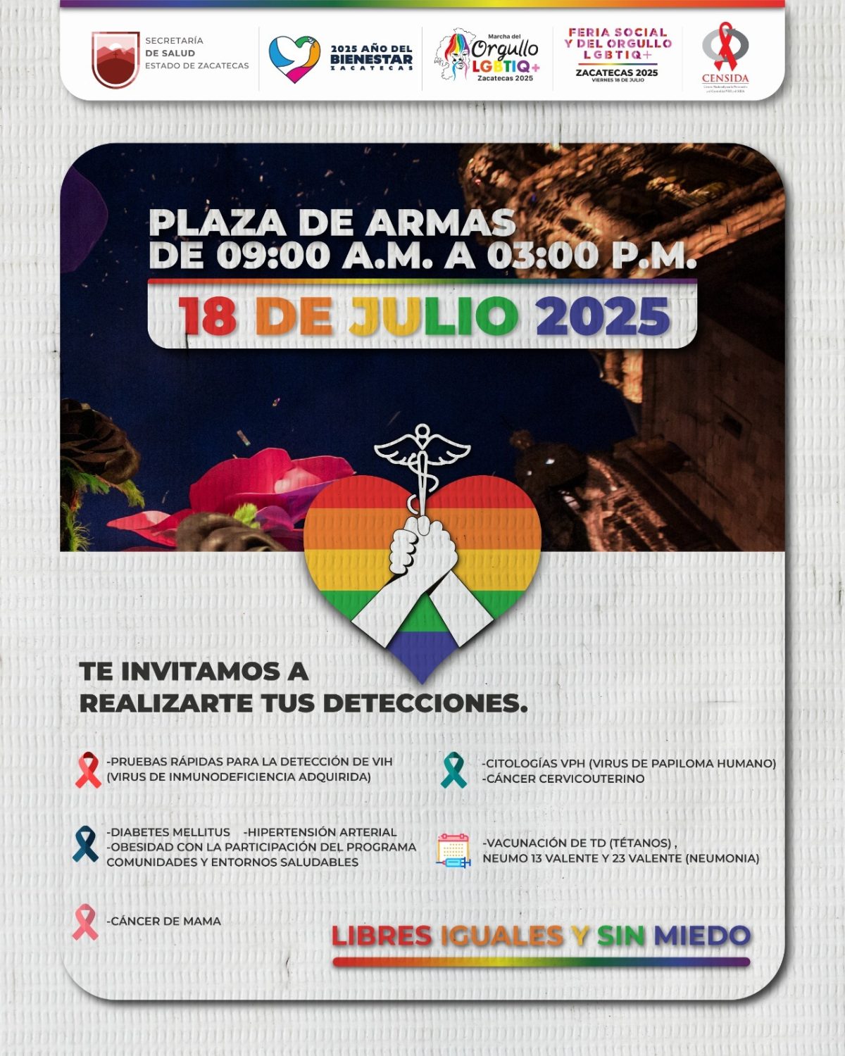 Zacatecas, Zac., 17 de julio de 2025.- Como parte de las actividades complementarias a la Marcha del Orgullo LGBTIQ+ Zacatecas 2025, la Secretaría de Salud (SSZ) participará en la Feria de Salud que se realizará el viernes 18 de julio, en la Plaza de Armas de la capital del estado.