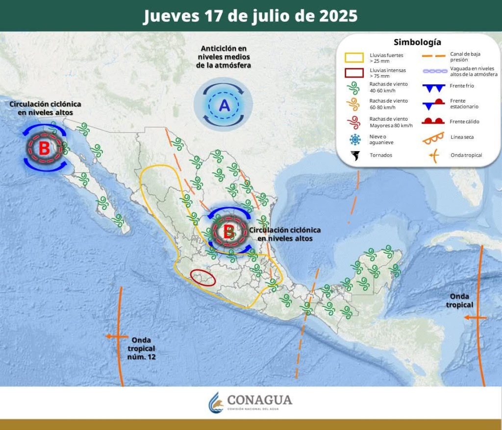 Nubosidad en gran parte del estado con bancos de niebla aislados y posibilidad de lluvias fuertes con puntuales muy fuertes de 50 a 75 mm para los municipios del suroeste, centro-sur y sur; con lloviznas y lluvias escasas en el resto del estado, durante la tarde y noche.