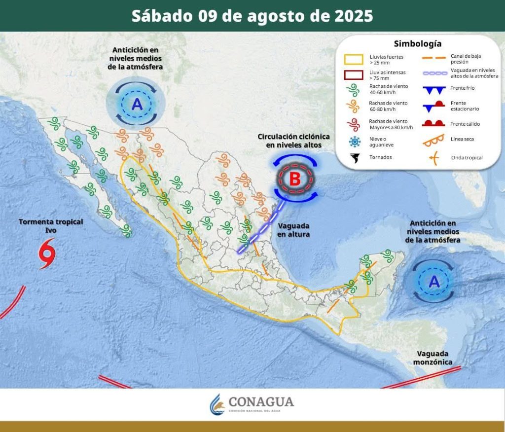 Nubosidad ocasional en gran parte del estado con bancos de niebla dispersa y posibilidad de lluvias con intervalos de chubascos de 5 a 25 mm para los municipios del centro-sur, suroeste y sur, durante la tarde y noche.