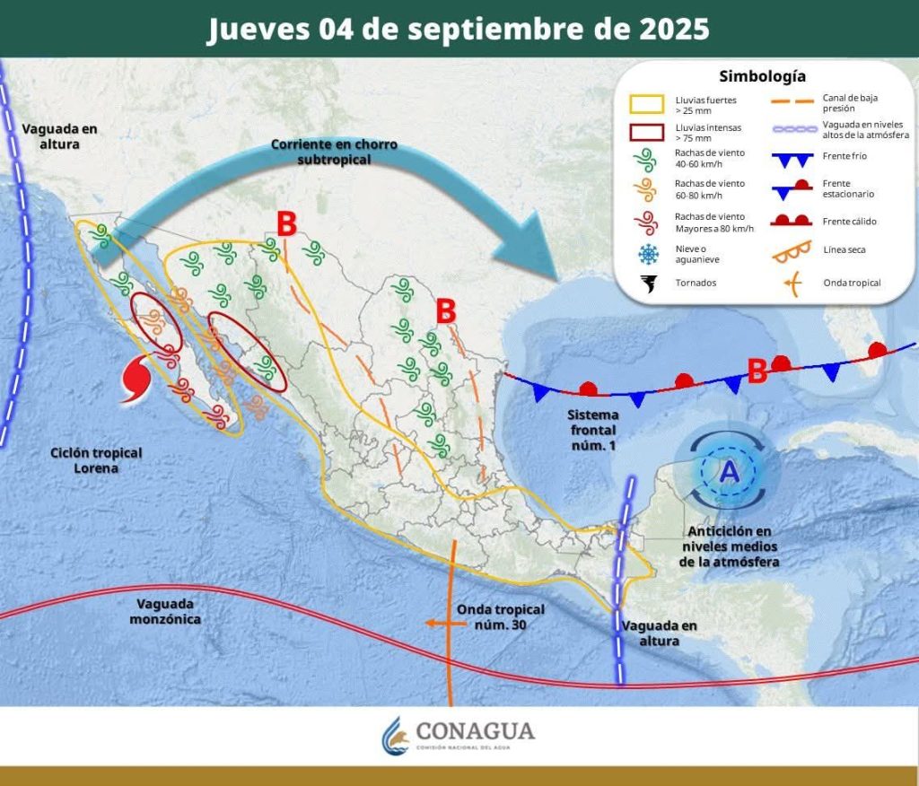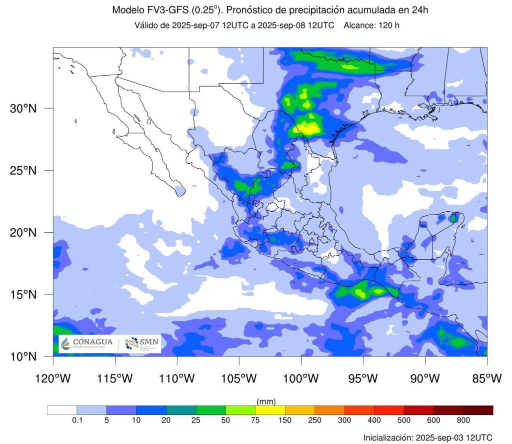 Nubosidad ocasional con bancos de niebla aislada en gran parte del estado con posibilidad de lluvias fuertes con puntuales muy fuertes de 50 a 75 mm para los municipios del norte, noroeste, oeste, centro, centro-sur, suroeste, sureste y sur del estado, durante la tarde y noche.