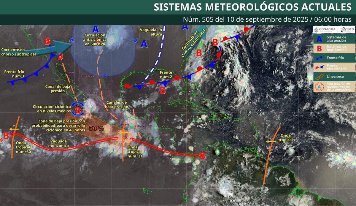 Nubosidad en gran parte del estado, con bancos de niebla denso y posibilidad de chubascos con lluvias puntuales fuertes de 25 a 50 mm para los municipios del norte, noroeste, oeste, centro, centro-sur, suroeste, sureste y sur del estado, durante la tarde y noche.
