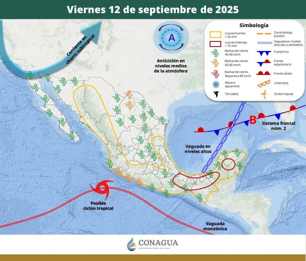 Nubosidad ocasional con bancos de niebla dispersos y posibilidad de lluvias con intervalos de chubascos de 5 a 25 mm para los municipios del centro-sur, sureste y sur del estado, durante la tarde y noche.