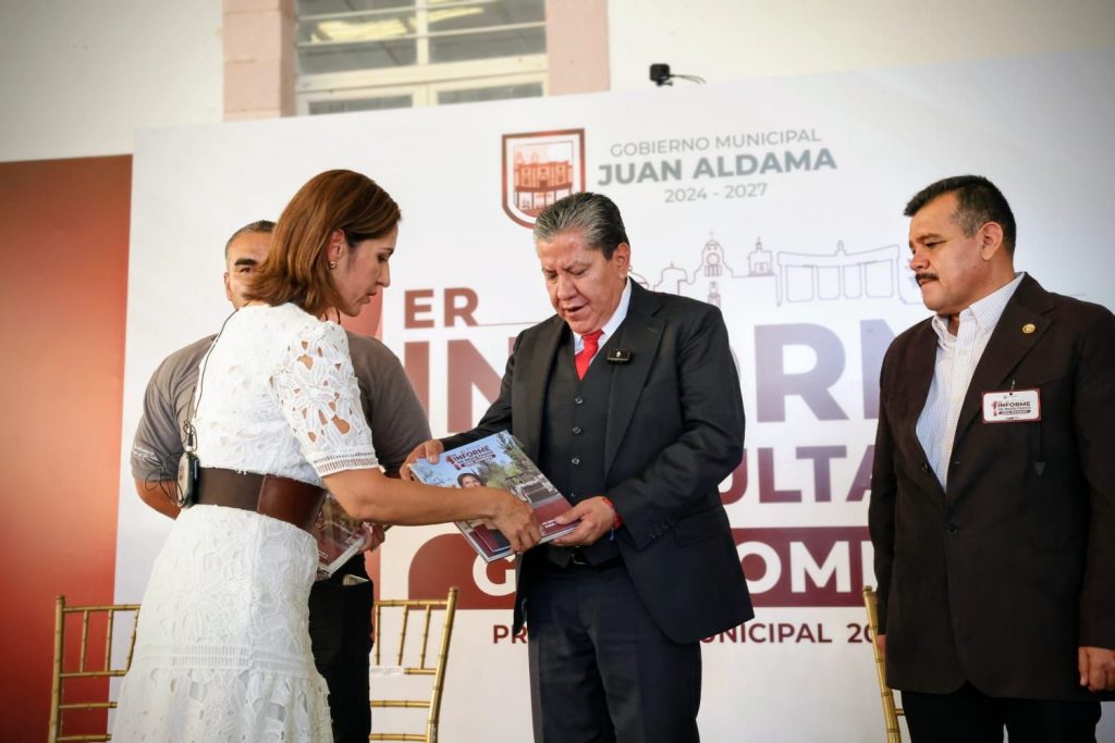 ● En su Primer Informe de Actividades, la Alcaldesa Griselda Romero Zúñiga destaca el gran apoyo que ha dado el mandatario estatal al pueblo de Juan Aldama