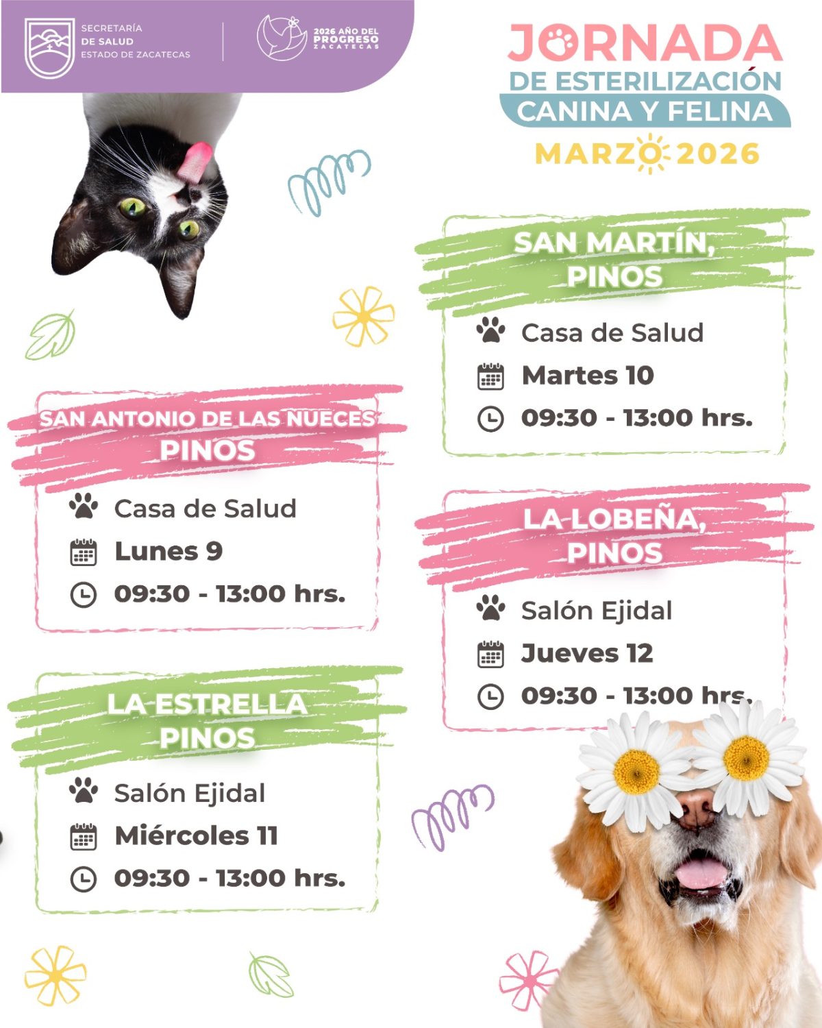 Zacatecas, Zac., 8 de marzo de 2026.- Para acercar servicios de calidad a la población de todas las regiones del estado, el Gobierno de Zacatecas, a través del personal de la Secretaría de Salud (SSZ), ofrecerá, de manera gratuita, cirugías para esterilizar a perros y gatos en el municipio de Pinos.