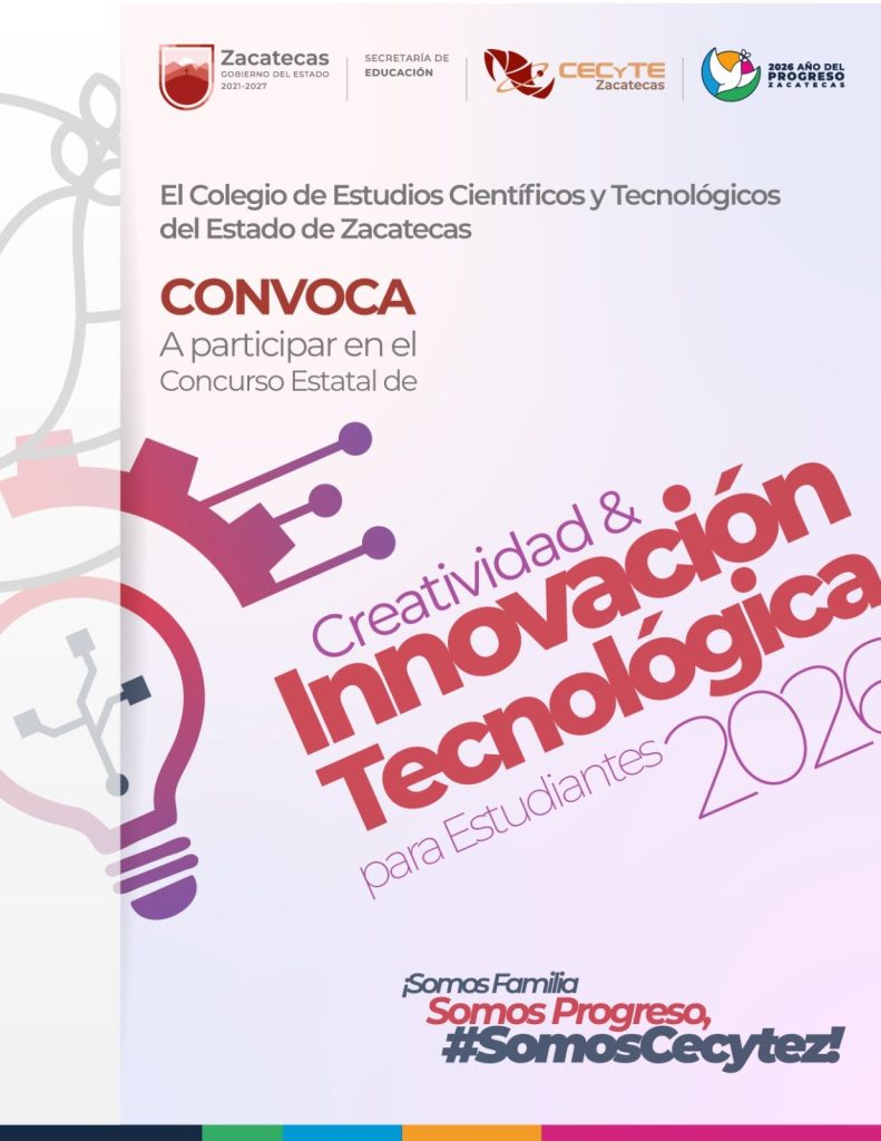 Zacatecas, Zac., 23 de marzo de 2026.- Con el propósito de fomentar el pensamiento creativo, el desarrollo tecnológico y la innovación entre las y los jóvenes, el Colegio de Estudios Científicos y Tecnológicos del Estado de Zacatecas (Cecytez) convoca a su estudiantado a participar en el Concurso Nacional de Creatividad e Innovación Tecnológica 2026 y representar con orgullo a la entidad.