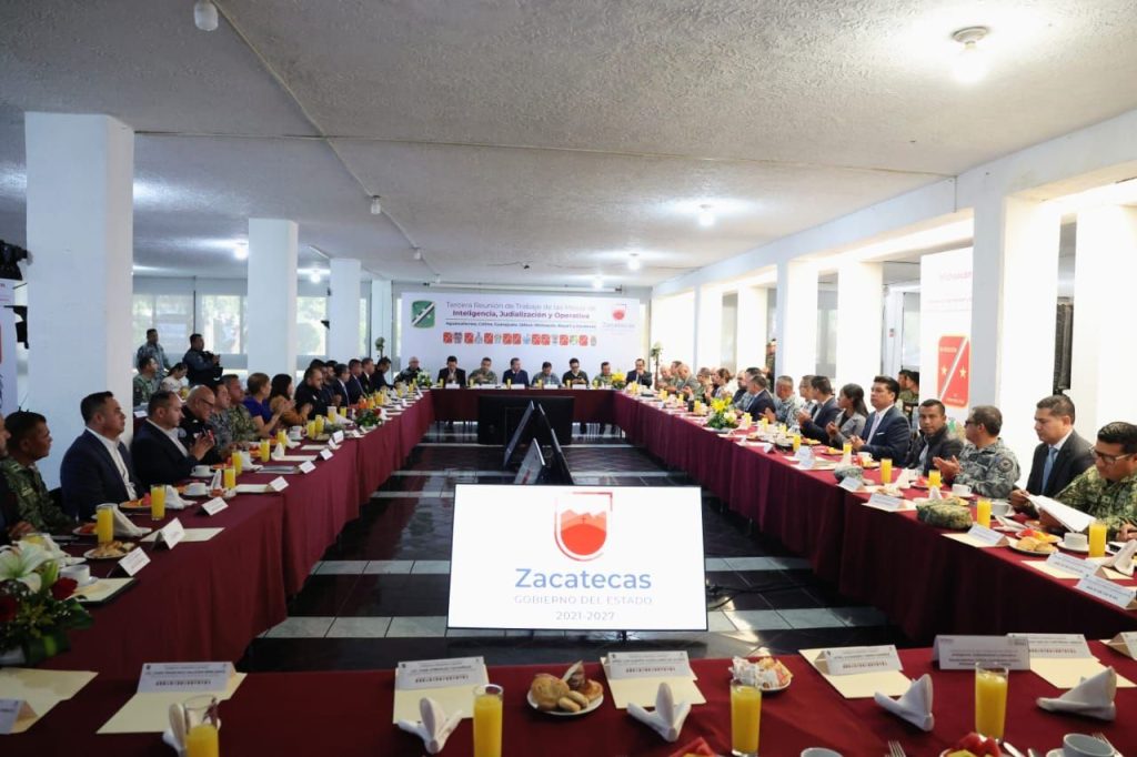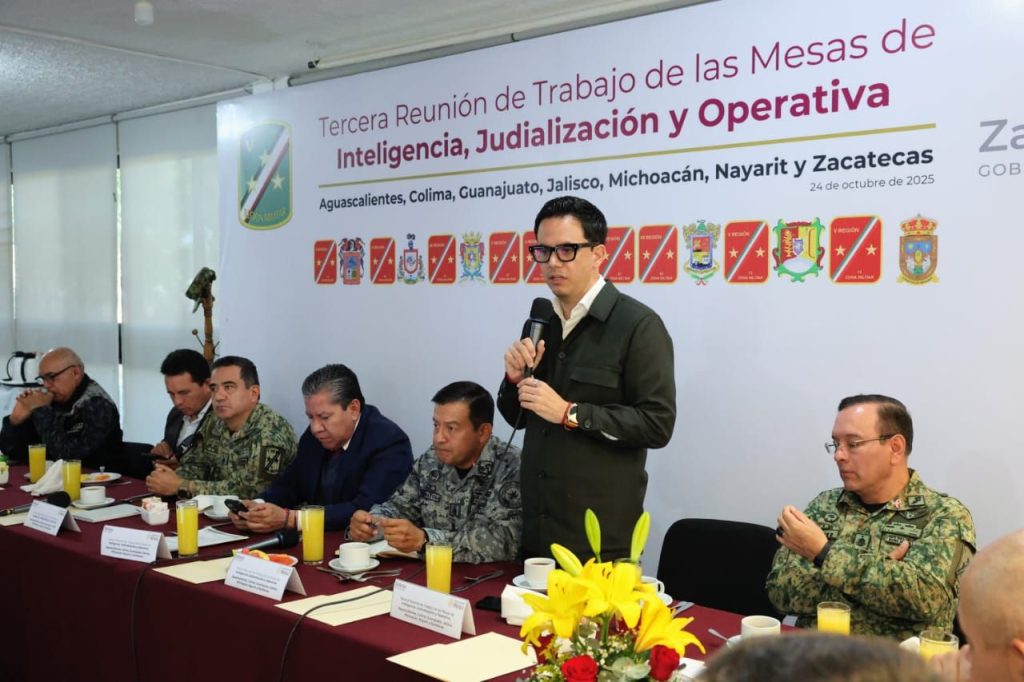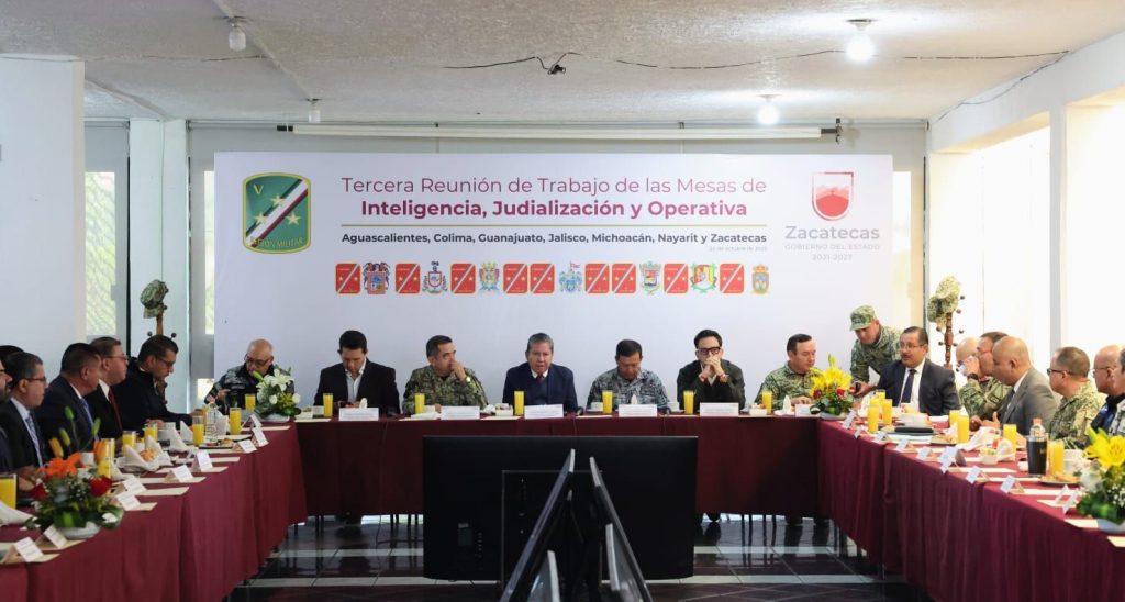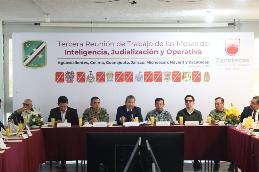 Guadalupe, Zac., 24 de octubre de 2025.- Con la asistencia de autoridades y mandos de siete entidades del país, el Gobernador David Monreal Ávila encabezó, en Zacatecas, la Reunión de Trabajo de las Mesas de Inteligencia, Judicialización y Operativa, que tiene el objetivo de fortalecer la coordinación interestatal en materia de seguridad y dar seguimiento a las acciones conjuntas de la Estrategia Nacional de Seguridad, que comanda la Presidenta Claudia Sheinbaum Pardo.
