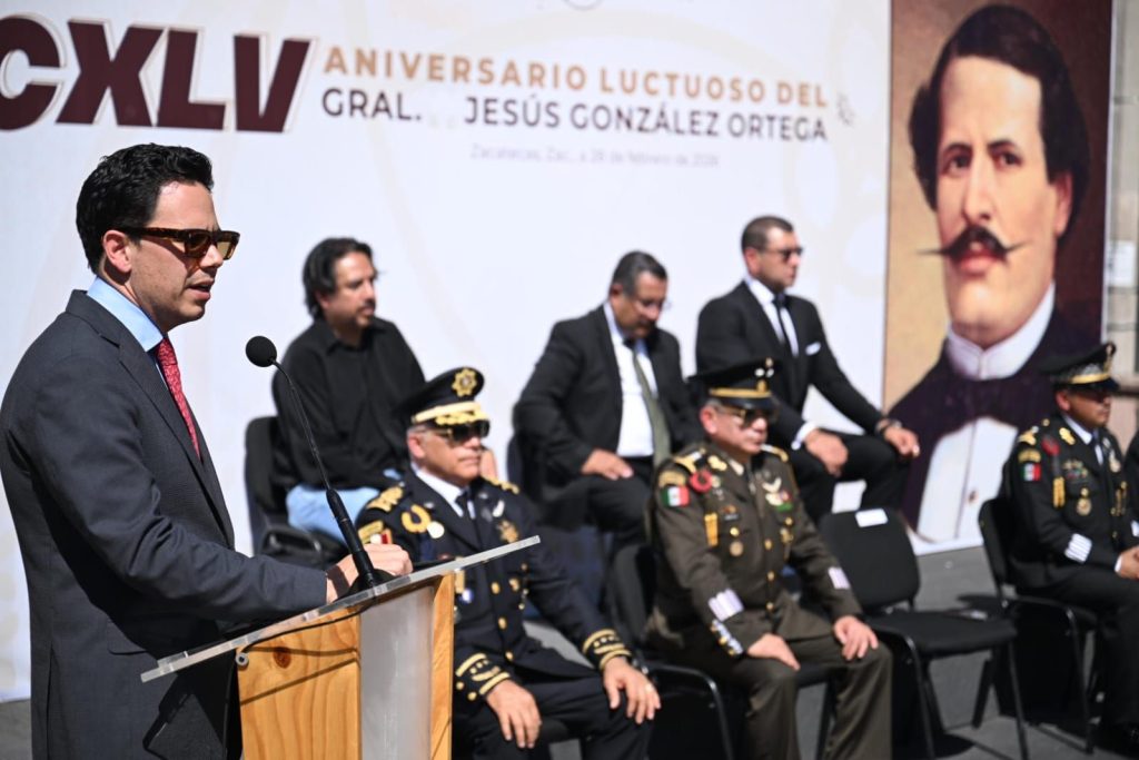 Zacatecas, Zac., 28 de febrero de 2026.- En Zacatecas hay estabilidad y Estado de Derecho, afirmó el Secretario General de Gobierno, Rodrigo Reyes Mugüerza, quien, con la representación del Gobernador David Monreal Ávila, encabezó la conmemoración del CXLV Aniversario luctuoso del General Jesús González Ortega.