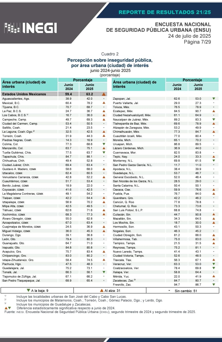 ● Publica INEGI la Encuesta Nacional de Seguridad Pública Urbana correspondiente al segundo trimestre de 2025