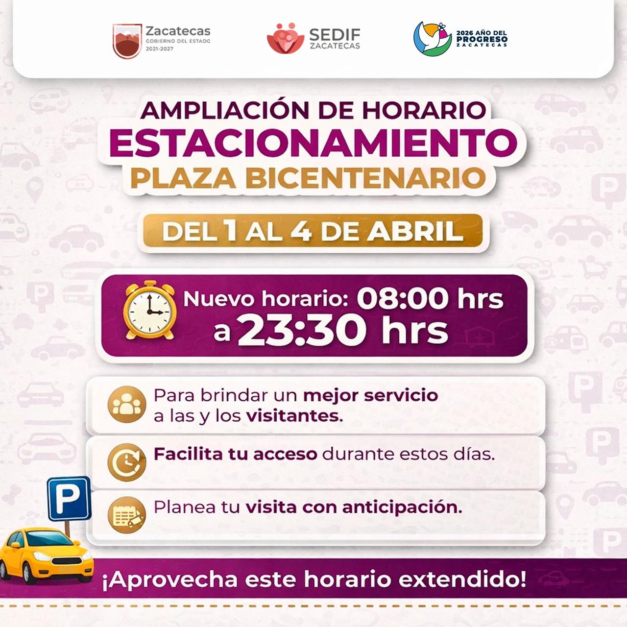 Zacatecas, Zac., 1 de abril de 2026.- Con el objetivo de brindar un mejor servicio a las y los visitantes, el Gobierno de Zacatecas amplió, de manera temporal, el horario del estacionamiento de Plaza Bicentenario, el cual operará de 08:00 a 23:30 horas, del 1 al 4 de abril.