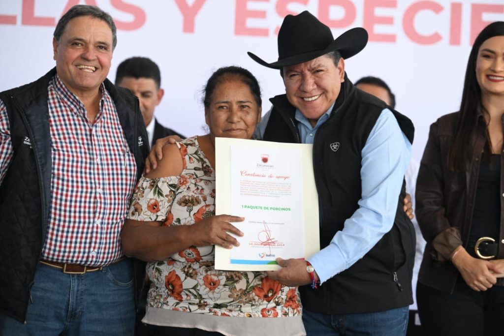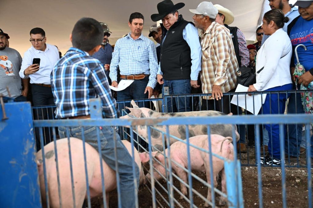 Hizo la entrega de paquetes de pie de cría de ovinos (hasta cuatro vientres y un semental) y porcinos (hasta tres vientres y un semental), así como apoyos en especie para la instalación de huertos hortofrutícolas y de nopal, dirigidos al autoconsumo y a la mejora en la calidad de vida de las familias rurales.