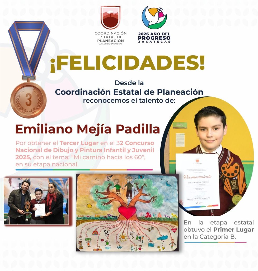 Zacatecas, Zac., 4 de marzo de 2026.- El estudiante Emiliano Mejía, de nivel primaria, obtuvo el tercer lugar en la Categoría B, en la etapa nacional, del 32° Concurso Nacional de Dibujo y Pintura Infantil y Juvenil 2025, que tuvo como tema “Mi camino hacia los 60”; compitió con niñas y niños de todo el país.