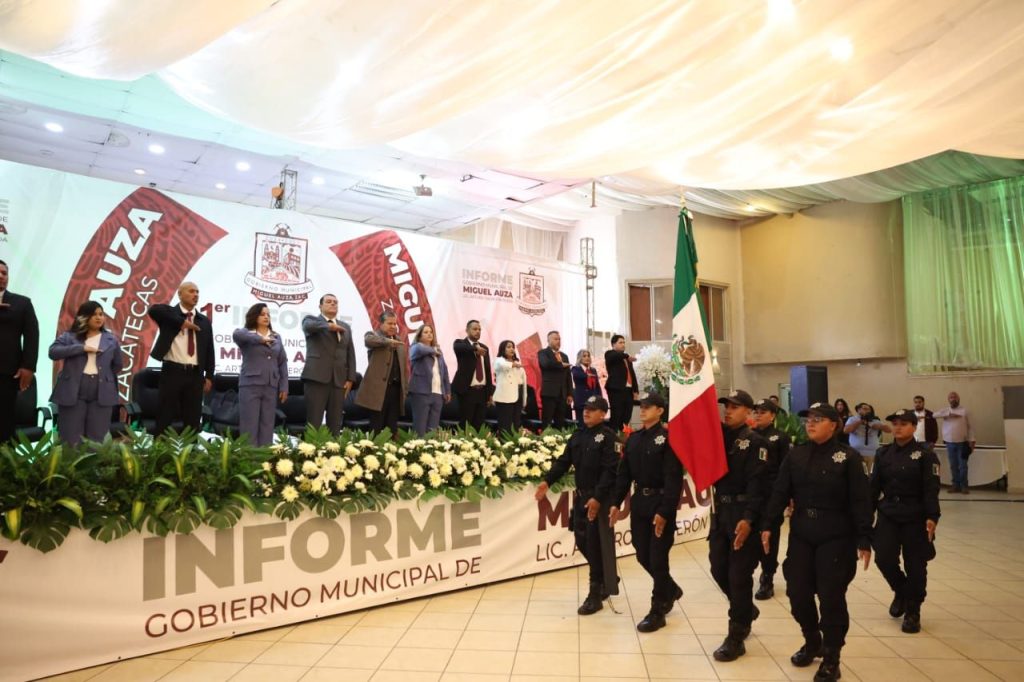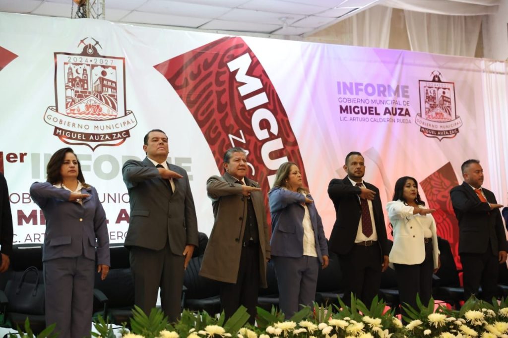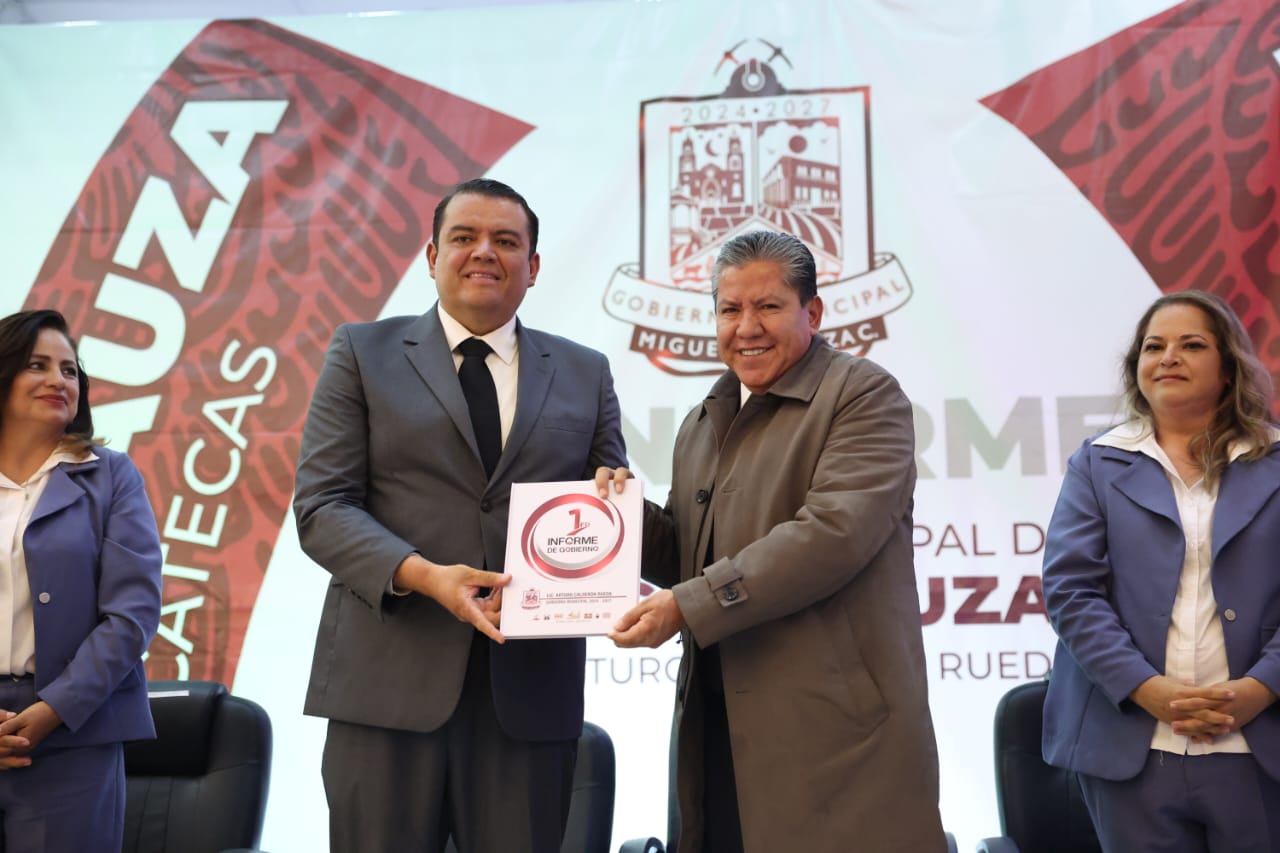 Miguel Auza, Zac., 11 de septiembre de 2025.- Al asistir como invitado especial a la ceremonia del Primer Informe de Gobierno del Presidente Municipal de Miguel Auza, Arturo Calderón Rueda, el Gobernador David Monreal Ávila ofreció total respaldo institucional, social y financiero para acelerar la transformación y el desarrollo de este territorio.