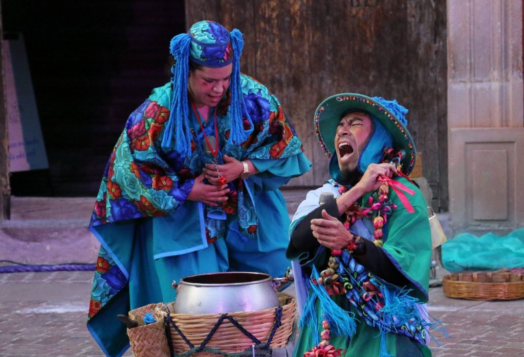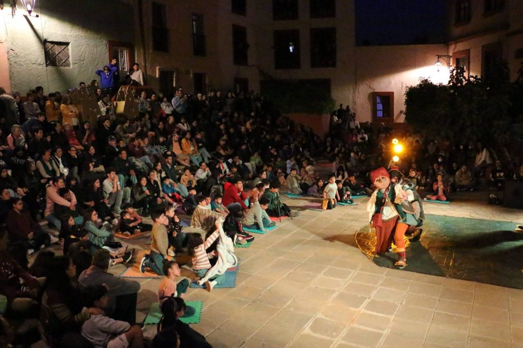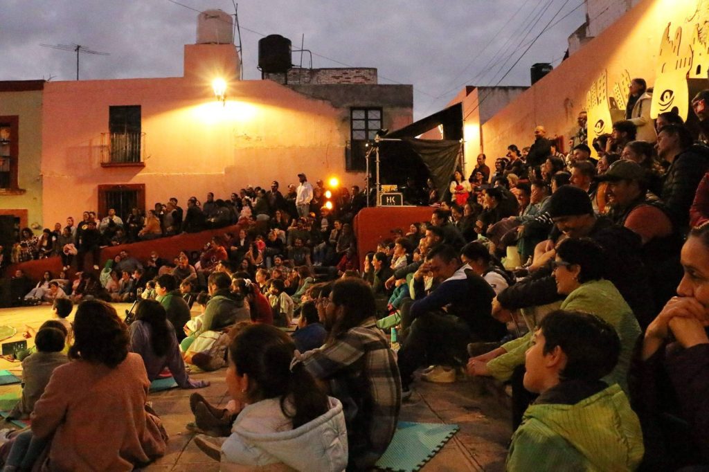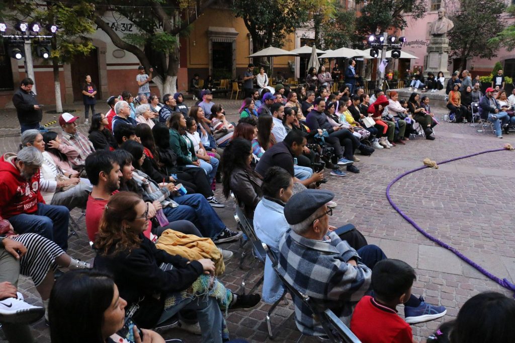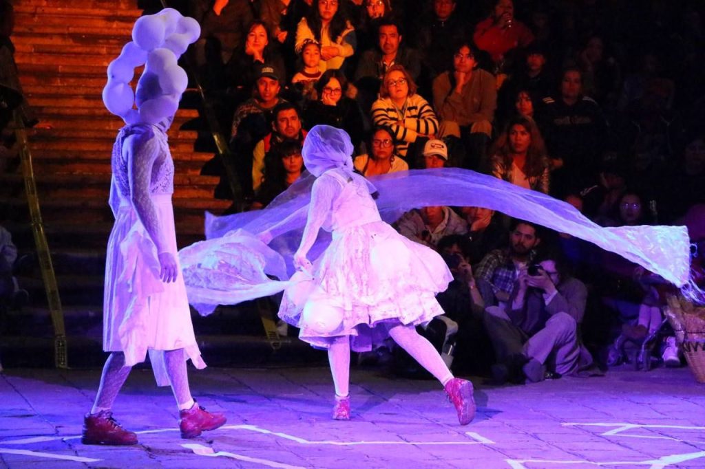 Más tarde, en la Plazuela Miguel Auza, La Quinta Teatro, de la Ciudad de México, ofreció “Palabras para mirar al cielo”, una entrañable puesta en escena que combinó poesía visual y teatro físico, que provocó en los espectadres reflexión y asombro.