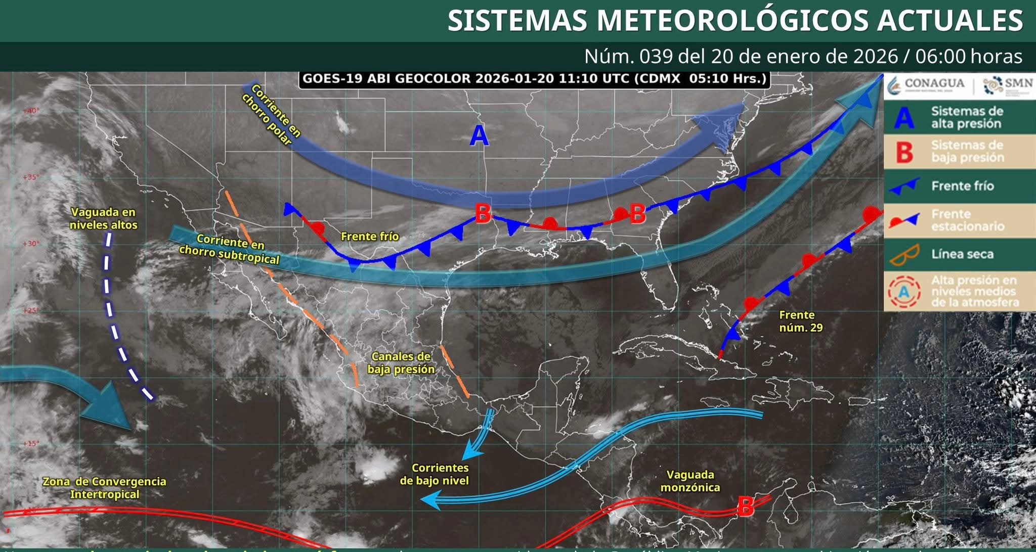 Nubosidad ocasional con bancos de niebla densos en gran parte del estado con posibilidad de chubascos con lluvias puntuales fuertes de 25 a 50 mm para los municipios del norte, noroeste, oeste, centro, centro-sur, suroeste, sureste y sur, durante la tarde y noche.