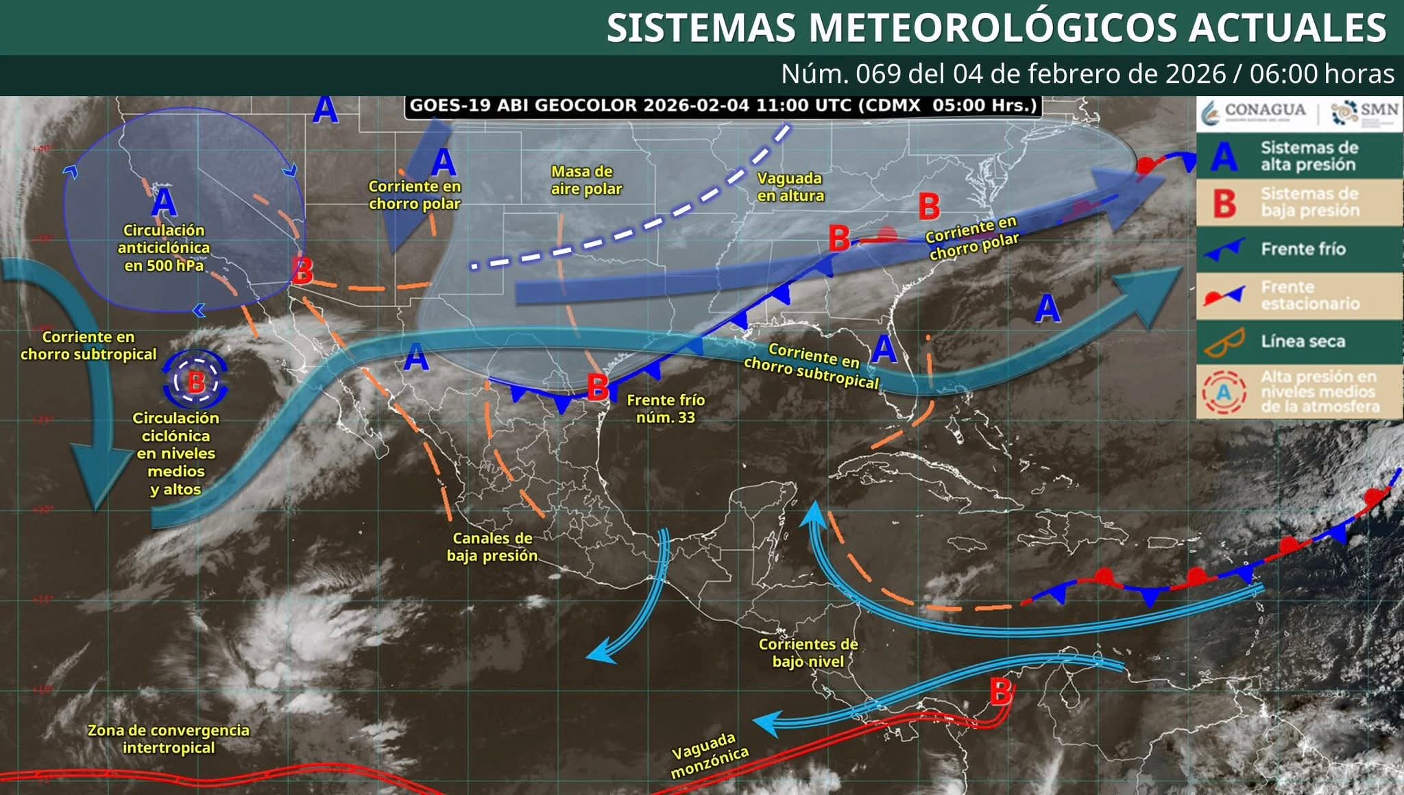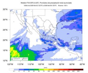 Nubosidad ocasional con bancos de niebla dispersa y posibilidad de lloviznas o lluvias aisladas 0.1 a 5 mm para los municipios del norte y noroeste del estado, durante la tarde-noche.