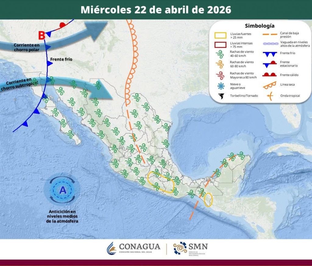 Vientos en dirección variable de 10 a 20 km/h del oeste y suroeste, con rachas superiores de 40 a 60 km/h en gran parte del estado, durante la tarde y noche.