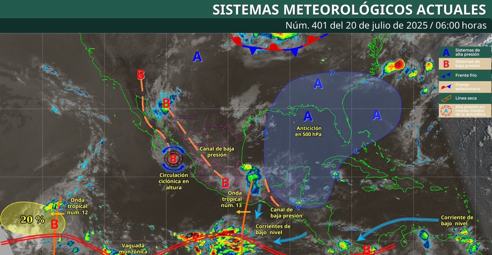 Nubosidad ocasional con bancos de niebla aislados en las regiones del oeste, centro y este, con posibilidad de chubascos con lluvias puntuales fuertes de 25 a 50 mm para los municipios del suroeste, centro-sur y sur del estado.