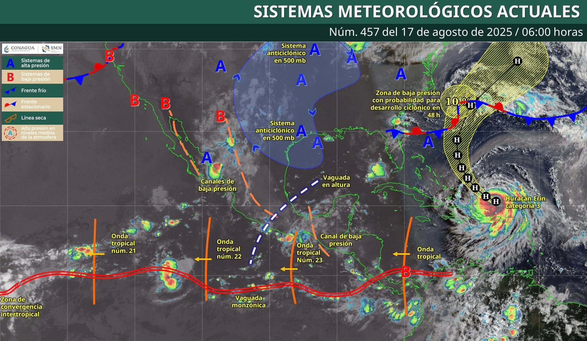 Nubosidad ocasional con bancos de niebla denso y posibilidad de lluvias con intervalos de chubascos de 5 a 25 mm para los municipios del norte, noroeste, oeste, centro, centro-sur y suroeste, durante la tarde y noche.