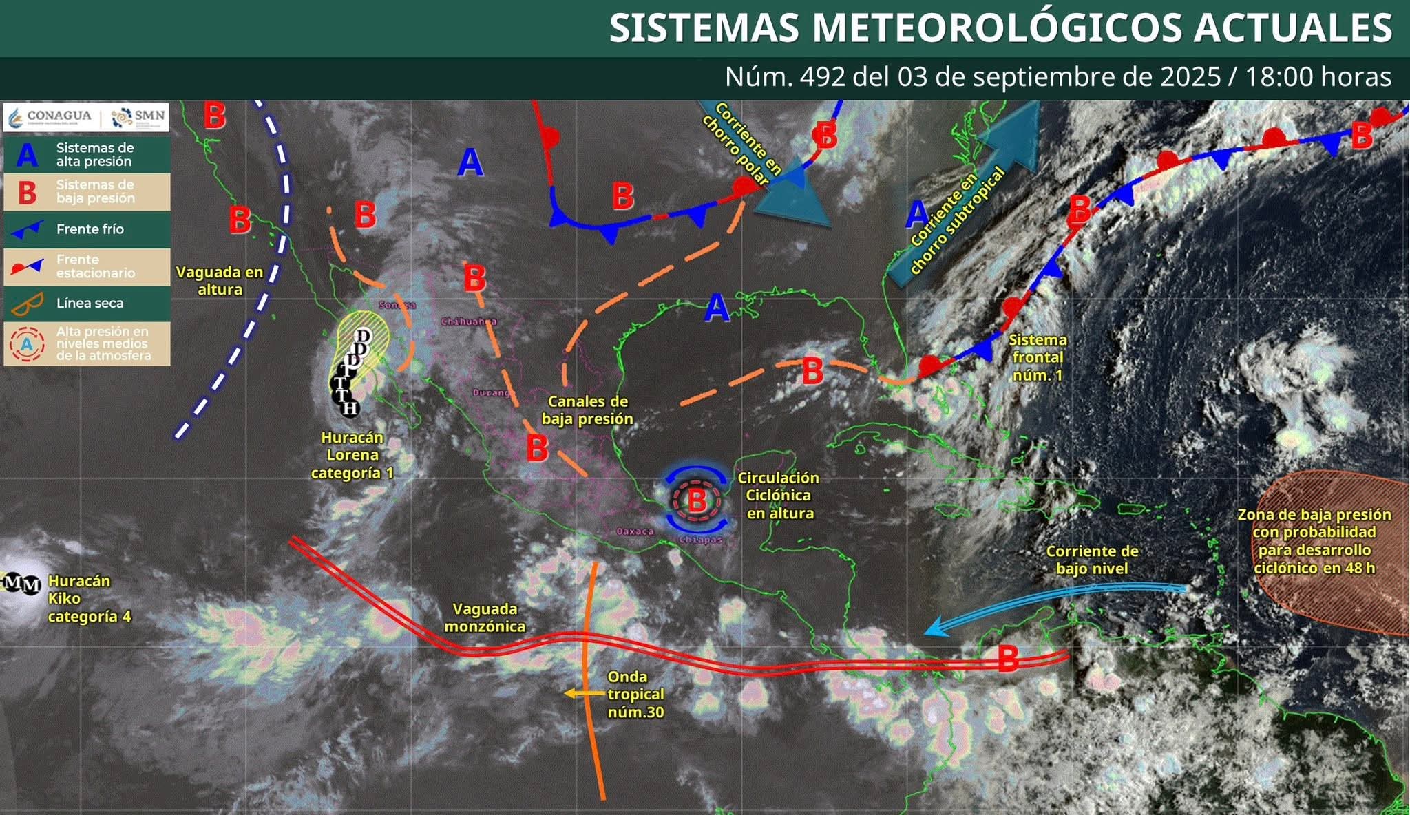 Nubosidad ocasional con bancos de niebla aislada en gran parte del estado con posibilidad de lluvias fuertes con puntuales muy fuertes de 50 a 75 mm para los municipios del norte, noroeste, oeste, centro, centro-sur, suroeste, sureste y sur del estado, durante la tarde y noche.