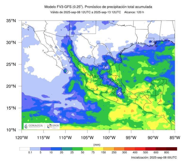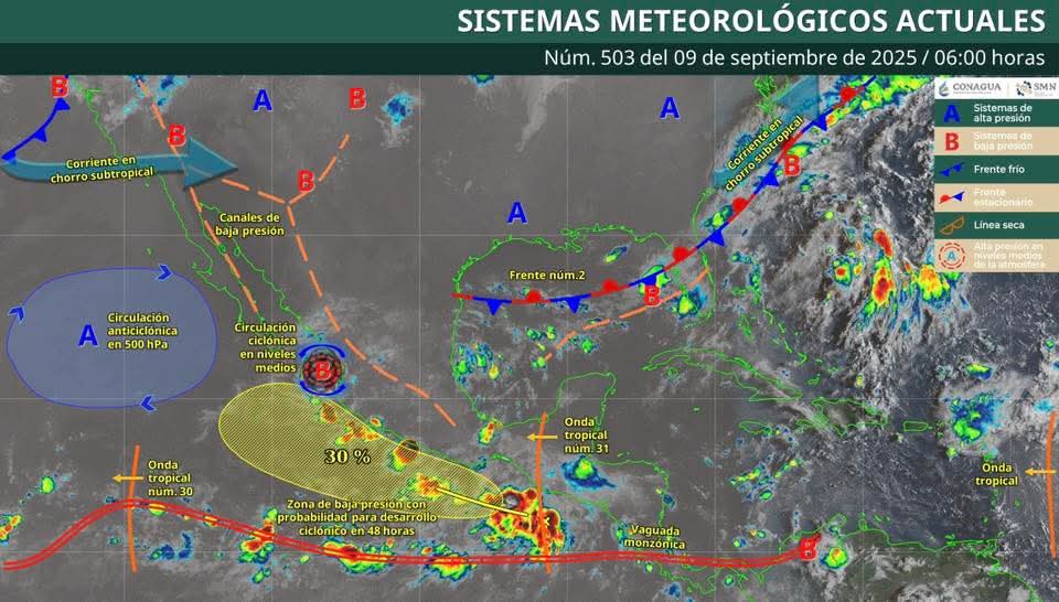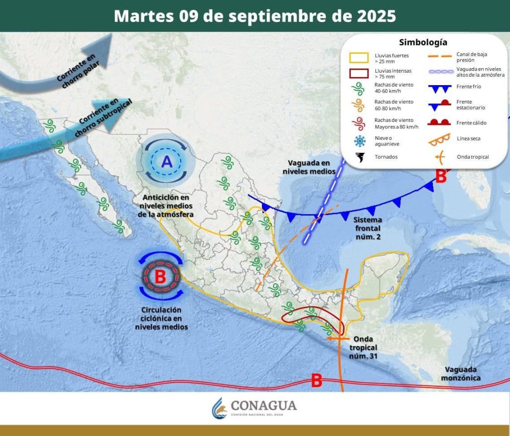 Nubosidad en gran parte del estado, con bancos de niebla denso y posibilidad de chubascos con lluvias puntuales fuertes de 25 a 50 mm para los municipios del oeste, centro, centro-sur, suroeste, sureste y sur del estado, durante la tarde y noche.
