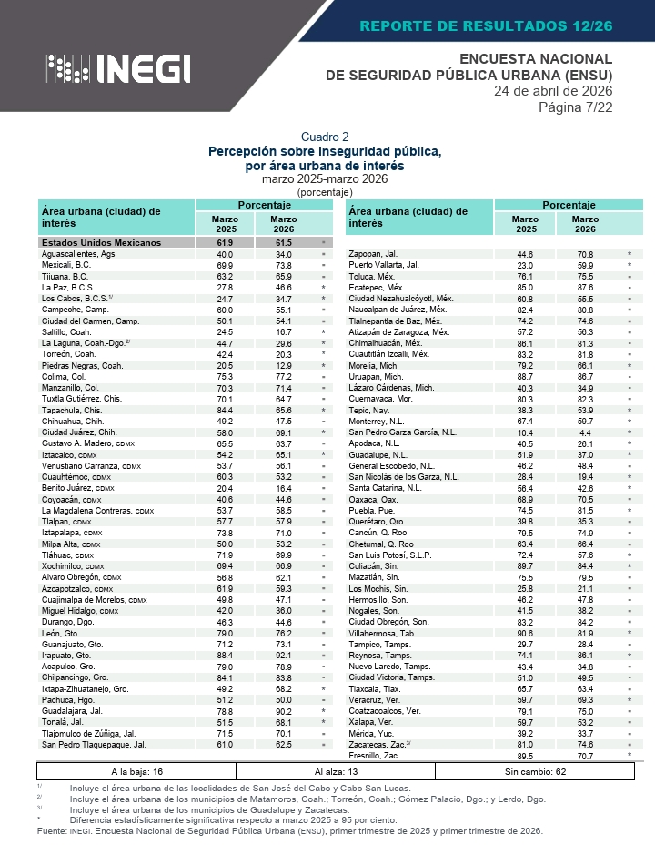 A nivel nacional, la ENSU primer trimestre 2026, levantada del 23 de febrero al 13 de marzo en 27 mil 300 viviendas distribuidas en 91 áreas urbanas, reporta que 61.5 por ciento de la población de 18 años y más consideró inseguro vivir en su ciudad, cifra estadísticamente menor al 63.8 por ciento de diciembre de 2025.