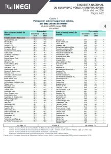 De las 91 ciudades, 15 presentaron reducciones significativas frente al trimestre anterior y seis registraron incrementos. Las ciudades con mayor percepción de inseguridad en el país son Irapuato (92.1 por ciento), Guadalajara (90.2) y Ecatepec (87.6); las de menor percepción son San Pedro Garza García (4.4), Piedras Negras (12.9) y Benito Juárez (16.4).