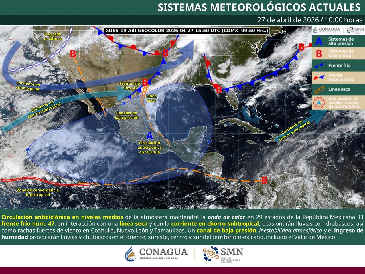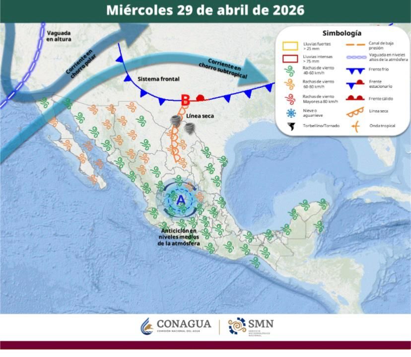 De acuerdo con información emitida por el Servicio Meteorológico Nacional, la ola de calor es provocada por una circulación anticiclónica (sistema de alta presión, cuyo viento caliente, que rota en sentido de las manecillas del reloj, disipa la humedad y cualquier posibilidad de lluvia), que continuará posicionada sobre el interior de la República Mexicana, lo que mantendrá ambiente de caluroso a extremadamente caluroso sobre el territorio nacional.